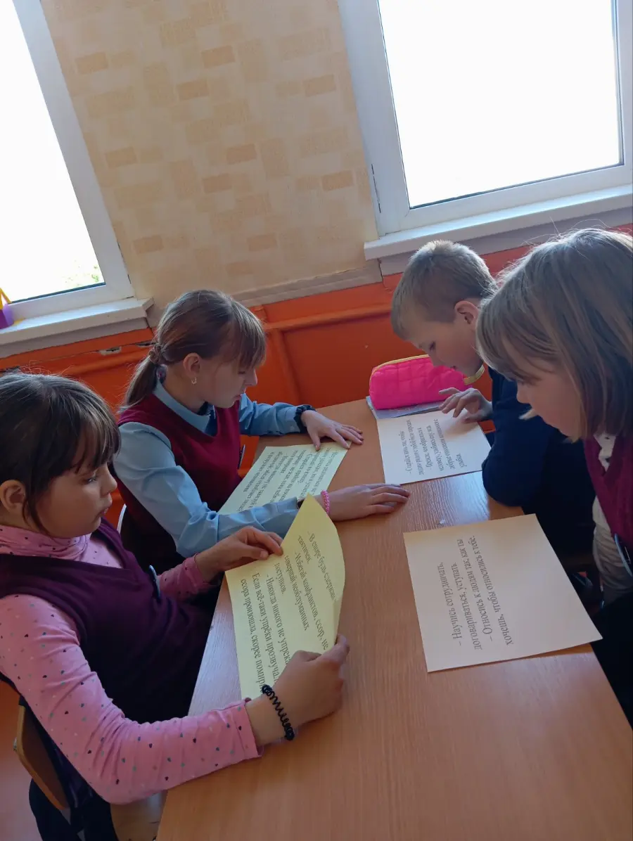В упражнении «Решение конфликтных ситуаций» четвероклассники разбирали реальные сценари. Интерактивная игра с карточками помогла отделить мирные стратегии (уступить, договориться, поставить себя на место другого) от разрушительных (кричать, драться, обвинять). Завершили встречу чтением «Правил бесконфликтного общения», которые стали личным обещанием класса.