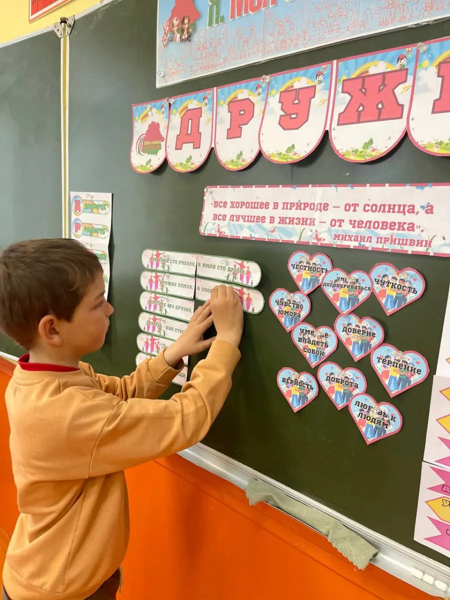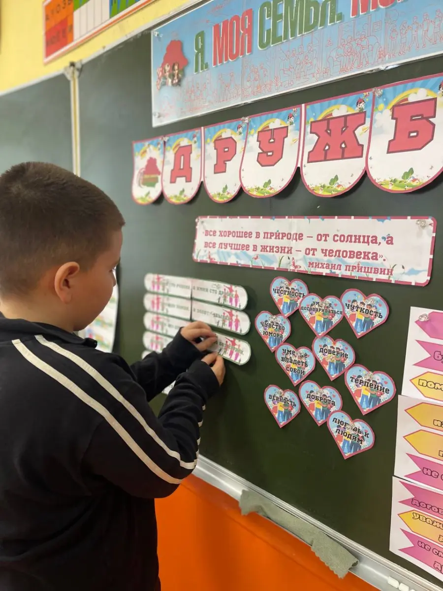 В 3 классе прошло тематическое мероприятие «Я. Моя семья. Моя Родина» на тему «Дружба». Занятие было нацелено на нравственное воспитание школьников и укрепление дружеских связей внутри коллектива. Занятие началось с вступительного слова педагога иобсуждения эпиграфа: «Всё хорошее в природе — отсолнца, а всё лучшее в жизни — от человека» (М. Пришвин). Ребята поразмышляли над смыслом цитаты и связали её с понятиями «общение»,«дружба» и «уважение». Ребята работали в группах, выбирая правильные окончания фраз (например: «Настоящие друзья всегда готовы прийти напомощь», «Настоящие друзья принимают меня таким, какой я есть»). Затем совместном формулировали «Правила дружбы», которые записали на доске. Учащиеся узнали о правилах и законах дружбы, поняли разницу между понятиями «друг», «приятель» и «знакомый»; научились выражать добрые чувства и проявлять внимание к одноклассникам; в классе укрепилась атмосфера взаимопонимания и поддержки; дети осознали, что дружный коллектив помогает каждому чувствовать себя увереннее и счастливее. Ребята ушли с занятия с улыбками и новыми идеями, как укреплять дружбу в своём классе. Подобные встречи важны для формирования нравственных ценностей и сплочения детского коллектива.